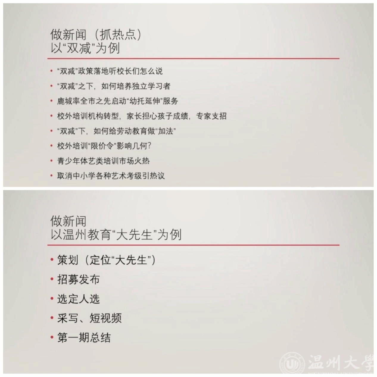 卓扬记者作为温州日报教育全媒体资深教育线记者,对温州地区的教育动态有着持续深入的报道,其参与采编的报道以深入的风格和独特的视角见长,善于捕捉温州本地教育与社会发展的新动态和亮点。在讲座中,卓扬记者将自己定位为“教育新闻搬砖人”,以谦和亲切的姿态分享了从业多年的实战经验,瞬间拉近了与听者的距离。