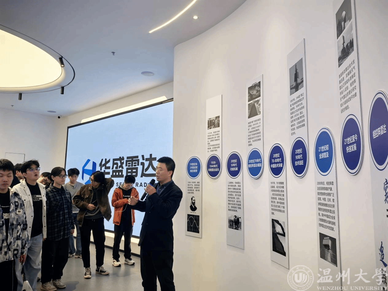 下午,同学们来到第三站:浙江华盛雷达股份有限公司(简称华盛雷达)。华盛雷达作为国内相控阵天气雷达领域的领军企业,从雷达设计仿真到芯片封装,从模块研制到整机装配测试,从嵌入式操作系统开发到应用平台研发,实现了100%自主研发,100%国产可控。在企业展厅,吴总亲自为同学们介绍了华盛雷达的企业历程与所获荣誉,讲解演示了气象监测预警一体化平台。最后,同学们参观了电路板焊接、震动测试等多类功能实验室。