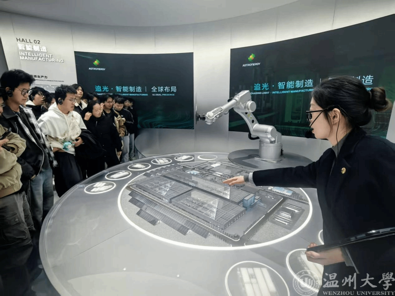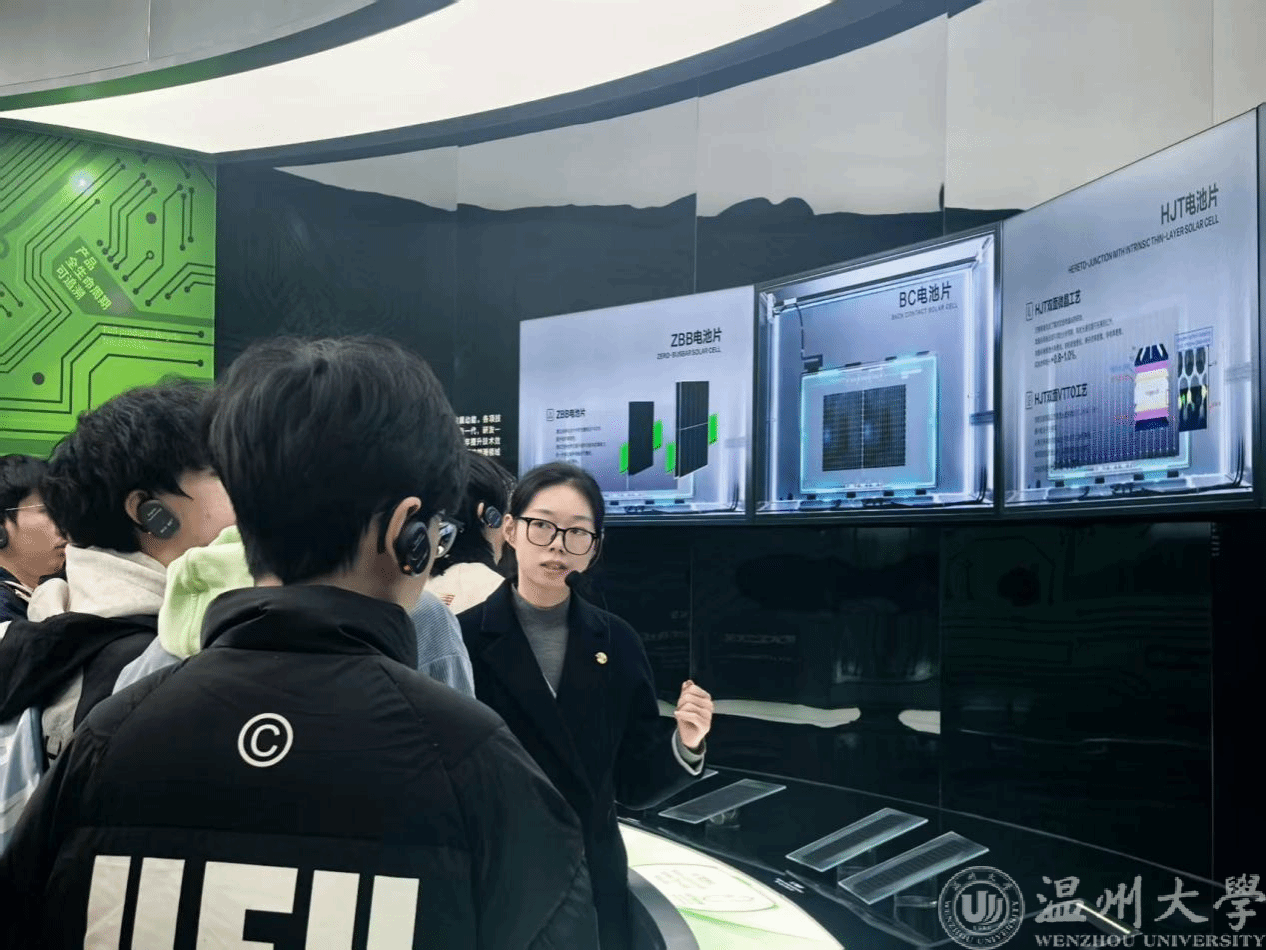 11月20日上午,见习队伍抵达嘉兴市的正泰新能科技股份有限公司(简称正泰新能)。正泰新能是正泰集团旗下专注光伏电池组件研发制造的子公司,主营高效晶硅电池与组件的研发生产,业务覆盖全球140多个国家和地区,在浙江海宁、江苏盐城等地设有11个智能制造基地。在企业工程师陈女士的陪同引导下,同学们参观了正泰新能的展示大厅,了解正泰新能的全球布局与核心产品,深刻领会了正泰新能在环境保护和可持续发展上的积极践行和探索;透过生产产线与组装产线的玻璃窗,直观了解了太阳能板的制造流程,现代化的厂区与严谨的生产氛围就让学子们感受到了科技企业的专业底蕴。