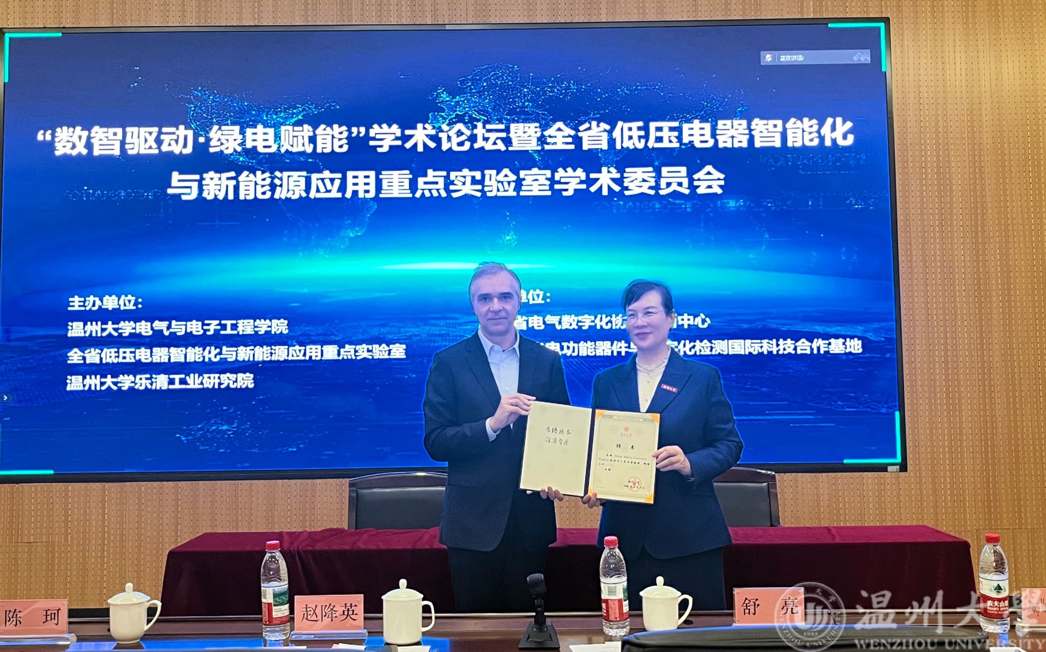 会议同时举行了丹麦技术科学院院士、浙江大学浣江实验室微电网研究中心主任Josep. M. Guerrero教授的荣誉教授聘任仪式。温州大学党委副书记赵降英为Guerrero院士颁发了聘书。Guerrero院士是全球微电网和可再生能源领域的顶尖学者,此次合作,将进一步推动温州大学电气与电子工程学院和全省重点实验室在国际合作与对外交流能力的提升。