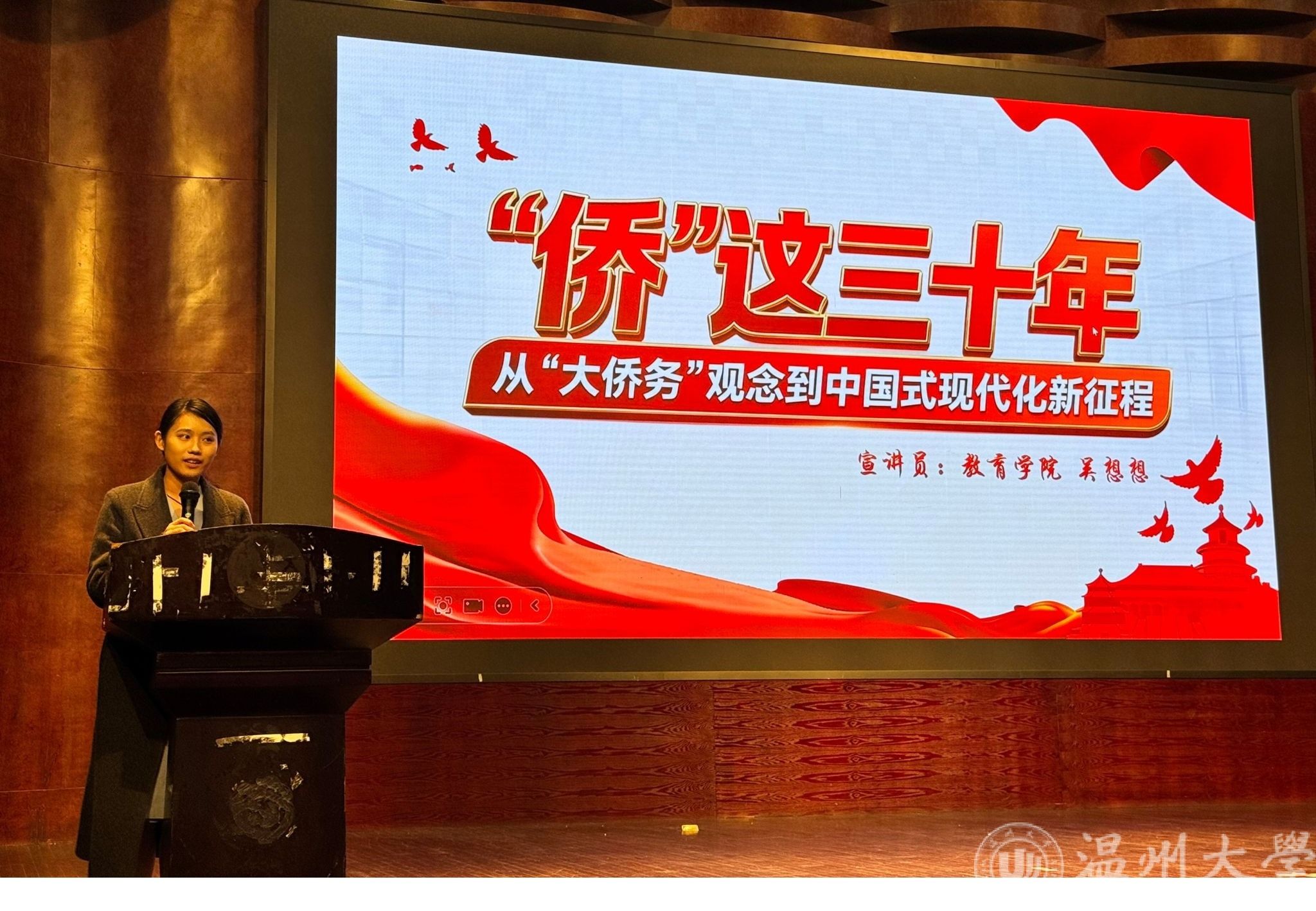 教育学院吴想想同学带来《“侨”这三十年:从“大侨务”观念到中国式现代化新征程》。她立足温州大学独特的“侨”背景,深情回顾学校因侨而生、为侨服务的历程,展现了“侨”力量在连接中外、助力现代化征程中的独特纽带作用。