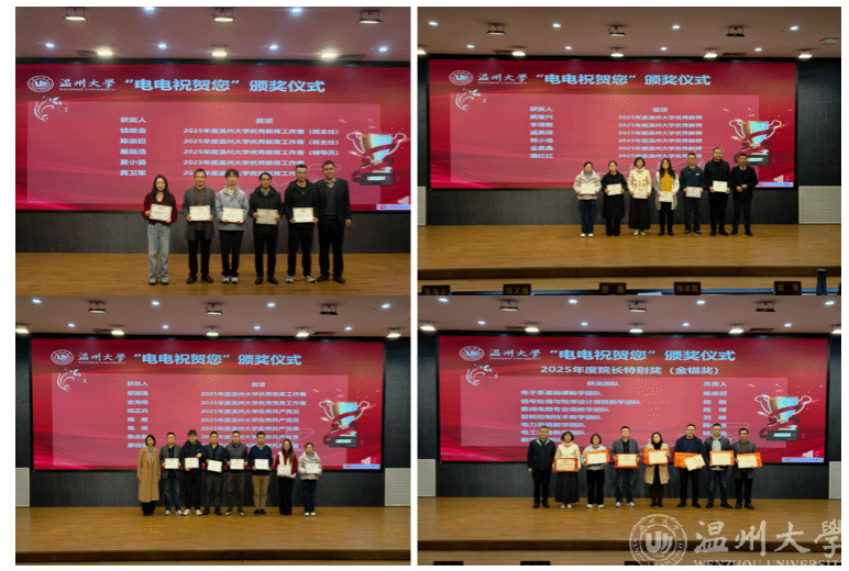 会上还举行了“电电祝贺您”表彰仪式,先后对温州大学第十四届“最受学生喜爱的老师”提名奖获得者、温州大学2025年度优秀共产党员、优秀党务工作者、优秀教师、优秀教育工作者(含班主任、辅导员),以及2025年度院长特别奖暨金锚奖获得者等先进典型进行了表彰。