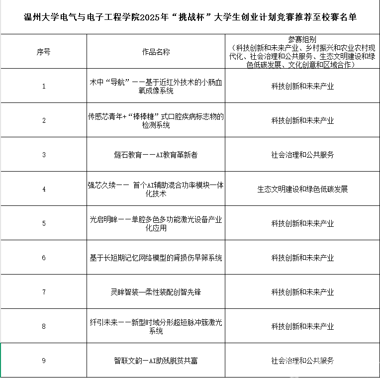 为深入学习贯彻习近平新时代中国特色社会主义思想,贯彻落实国家双创工作部署,进一步聚焦为党育人功能,引导和激励大学生通过开展广泛的社会实践、深刻的社会观察,不断增强对国情社情的了解,将所学知识与经济社会发展紧密结合,提高创新创业意识,提升社会化能力,温州大学电气与电子工程学院于2025年11月5日举办了第十三届“挑战杯”大学生创业计划竞赛初赛。经选手汇报和答辩、专家评审,现将拟推荐队伍公示如下,最终结果以校团委评审为准。