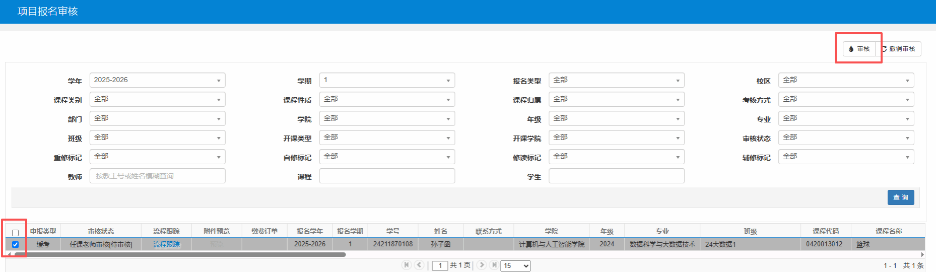 路径:信息维护-项目报名审核-勾选对应课程后点击审核