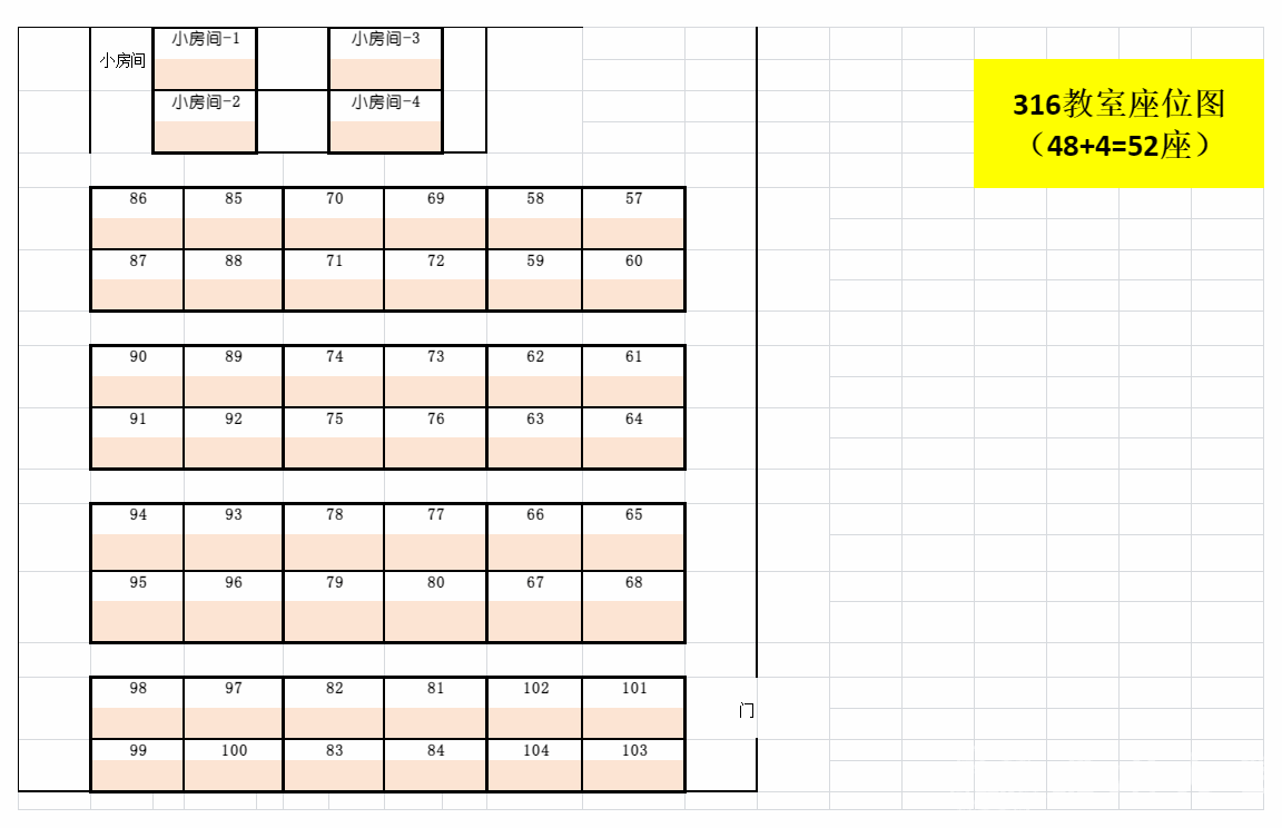 本次开放考研自习室座位共计110个(其中1A-318教室58个,1A-316教室52个)。资源有限,先到先得,额满即止。座位如下图。