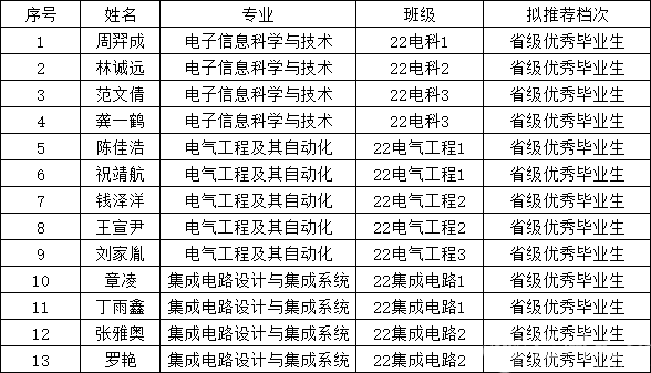 根据《浙江省教育厅办公室关于确认 2026 届浙江省普通高等学校优秀毕业生的通知》和《温州大学2026届本专科生优秀毕业生预评工作通知》,按照学校最终分配名额(2026届本专科优秀毕业生名额分配表(确认).xls),根据前期进行2026届省级优秀毕业生的预评选办法,拟推荐 22电科1 周羿成 等13名同学获得省级优秀毕业生荣誉称号,现将名单进行公示。