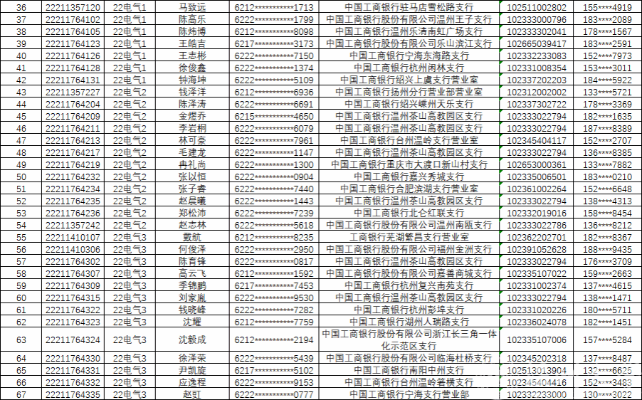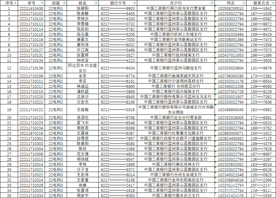 2.公示名单中的银行卡号、联系方式等已做脱敏处理(中间位以*代替),请同学们仔细回忆并核对前后四位及开户行信息。如有错误,请务必在公示期内反馈。
