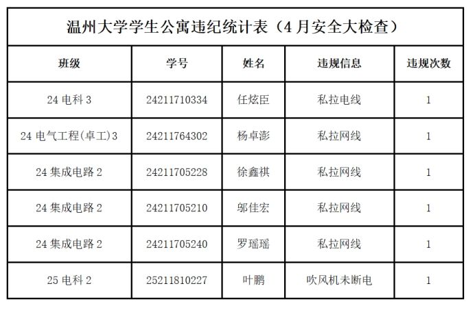 为进一步加强宿舍安全管理,规范寝室内务秩序,筑牢校园安全防线,学校于2026年4月组织开展全校寝室安全、卫生专项大检查。经查,我院任炫臣等六名同学在宿舍内存在违规行为,违反校园宿舍管理相关要求。依据校纪校规及学院学生管理规定,现对该六名同学予以院内通报批评。对经批评教育后仍拒不整改、屡教不改者,将依规给予警告至记过等相应纪律处分。