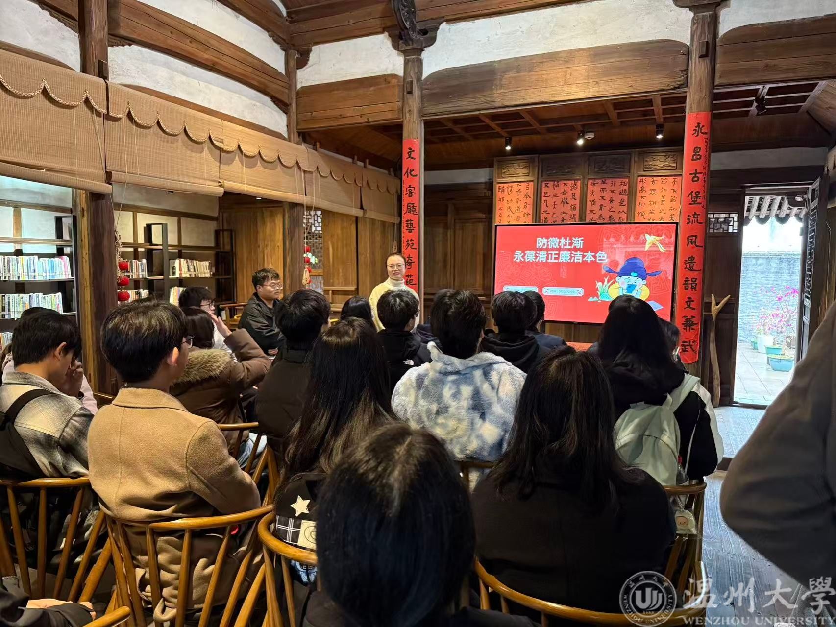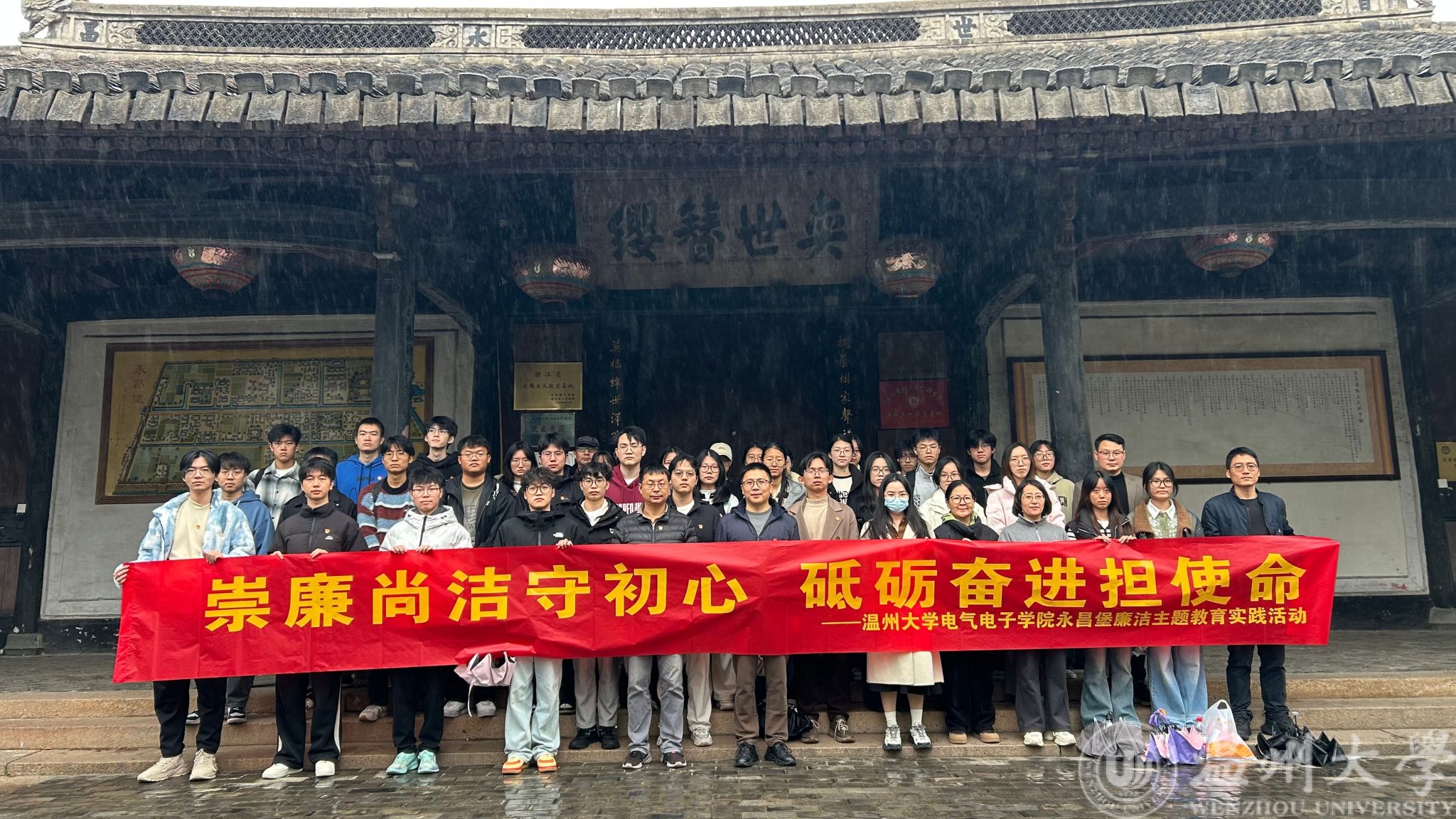 淅淅沥沥的小雨浸润着永昌古堡的青砖黛瓦,也让廉洁初心在师生心中深深扎根。为深入推进党风廉政建设,构建“教工引领、学生紧跟、师生共学”的廉洁教育格局,近日,温州大学电气与电子工程学院组织学院纪委委员、行政教工党支部党员、23名新发展党员及24名即将转正的预备党员,赴温州龙湾永昌堡开展“师生共上一堂廉洁党课”主题教育活动,以“实地研学+专题授课”的形式,引导教师党员重温初心,崇廉尚洁,教育青年学生扣好廉洁自律“第一粒扣子”。