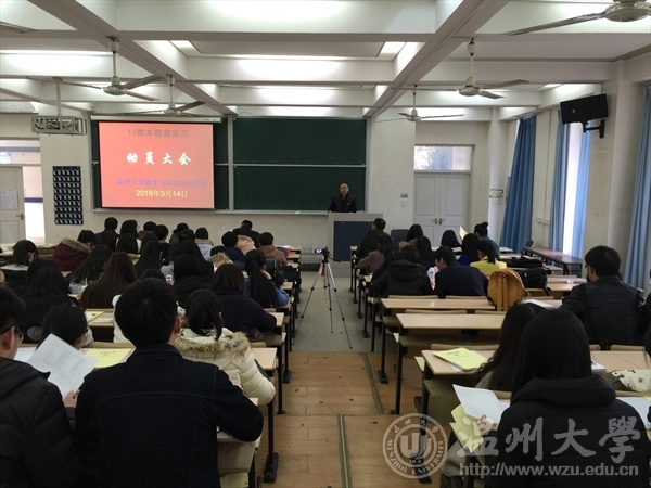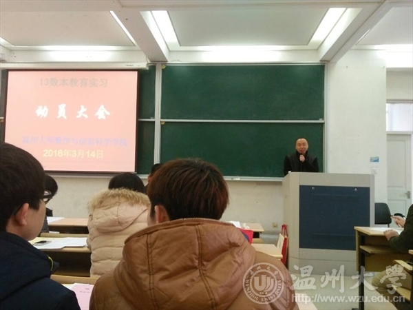 2016年3月14日上午10时,数信学院13数本全体实习生和我院指导师近120人在3B102召开教育实习动员大会。本次教育实习是近五年实习生人数最多的一届,共安排了温州南浦实验中学、温19中、温州第二实验中学、瓯海第一高级中学、瑞安市第三中学五个集中教育实习点,另外还有17位同学被批准参加自主教育实习。会议由黄忠裕老师主持。首先,数学学院副院长应裕林老师代表学院讲话,他指出我院一直非常重视教育实习工作,在历届教育实习中都给实习中学留下了良好的印象,希望全体实习生认真完成实习各项任务,通过实习提高教育教学能力,为今后考编等就业竞争打下良好基础。随后,黄忠裕老师就教育实习计划安排和任务要求做了详细解读,并布置近期实习试讲和进点任务。最后,实习生分组与我院实习指导师见面,具体落实试讲等实习工作。