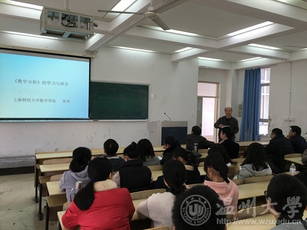 2016年3月11日下午,上海财经大学博士生导师周勇教授应我院的邀请,在温州大学南校区数学与信息科学学院3B201作了题为“《数学分析》的学习与体会”的专题报告,数学与信息科学学院领导、全体老师以及15级本科生参加了报告会,会议由高利新院长主持。