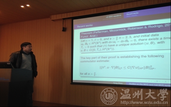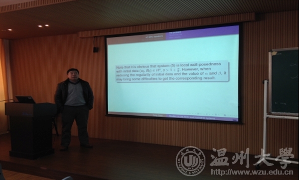 在报告会上,周勇教授主要介绍了他及其研究团队近些年来在磁流体方程解的适定性与正则性准则等方面的研究工作,并提出了一些公开问题。学术报告从二维广义的MHD方程谈起,周教授仔细地介绍了方程的结构及其物理背景,回顾了一些相关的研究结果,其中不乏数学大家的工作,并进行了比较;随后,周教授介绍了n维MHD方程的一些结果,简单地讲解了证明的思路和方法;最后,在霍尔效应(Hall effect)的作用下,介绍了3维Hall-MHD方程,报告了正则性的部分研究结果。在报告结束后,周勇教授与赵才地教授,安荣副教授等在MHD以及Navier-Stokes方程的正则性方面进行了探讨,同时也解答了研究生同学的一些疑问。