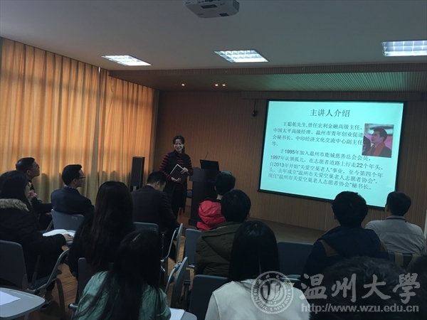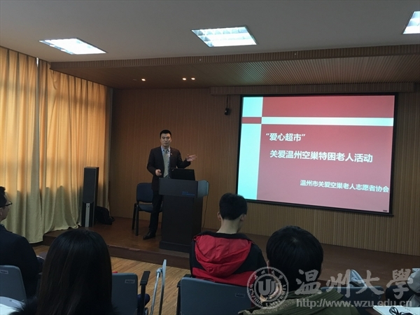 王老师在讲座中谈到,近几年随着人口老龄化程度的加深,空巢老人越来越多,已经成为一个不容忽视的社会问题。王老师从服务的初衷、服务的对象、服务的内容、服务的范围四方面介绍温州市关爱空巢老人志愿者协会对空巢老人的关注。“供己所需”是关爱空巢老人志愿者协会的服务宗旨。只有明白老人所需,才能提供给老人最需要的帮助。