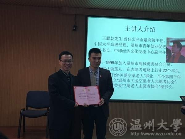 王聪乾简介:曾任宏利金融高级主任、中国太平高级经理、温州市青年创业促进会秘书长、中印经济文化交流中心副主任。于1995年加入温州市鹿城慈善总会会员,1997年认领孤儿,在志愿者道路上行走21年。自2013年开始“关爱空巢老人”事业,至今第四个年头,去年成立“温州市关爱空巢老人志愿者协会”,现任“温州市关爱空巢老人志愿者协会”秘书长。